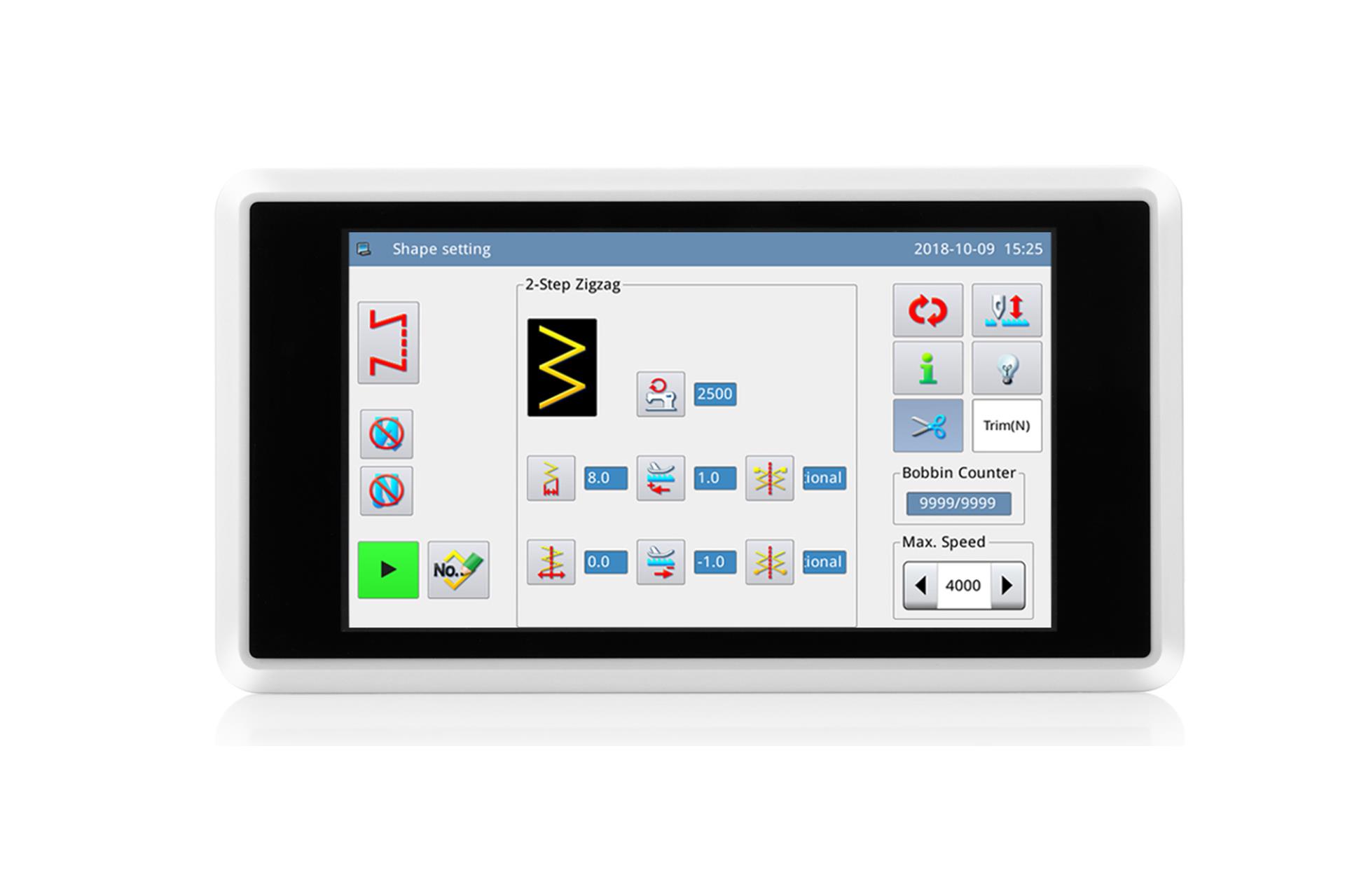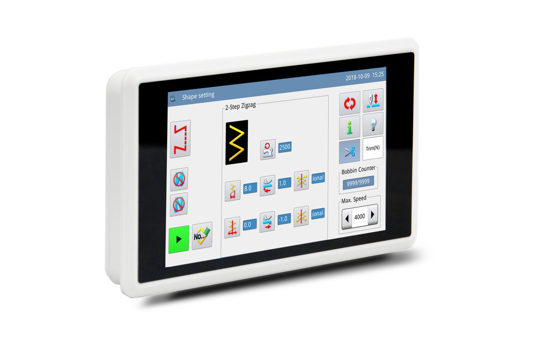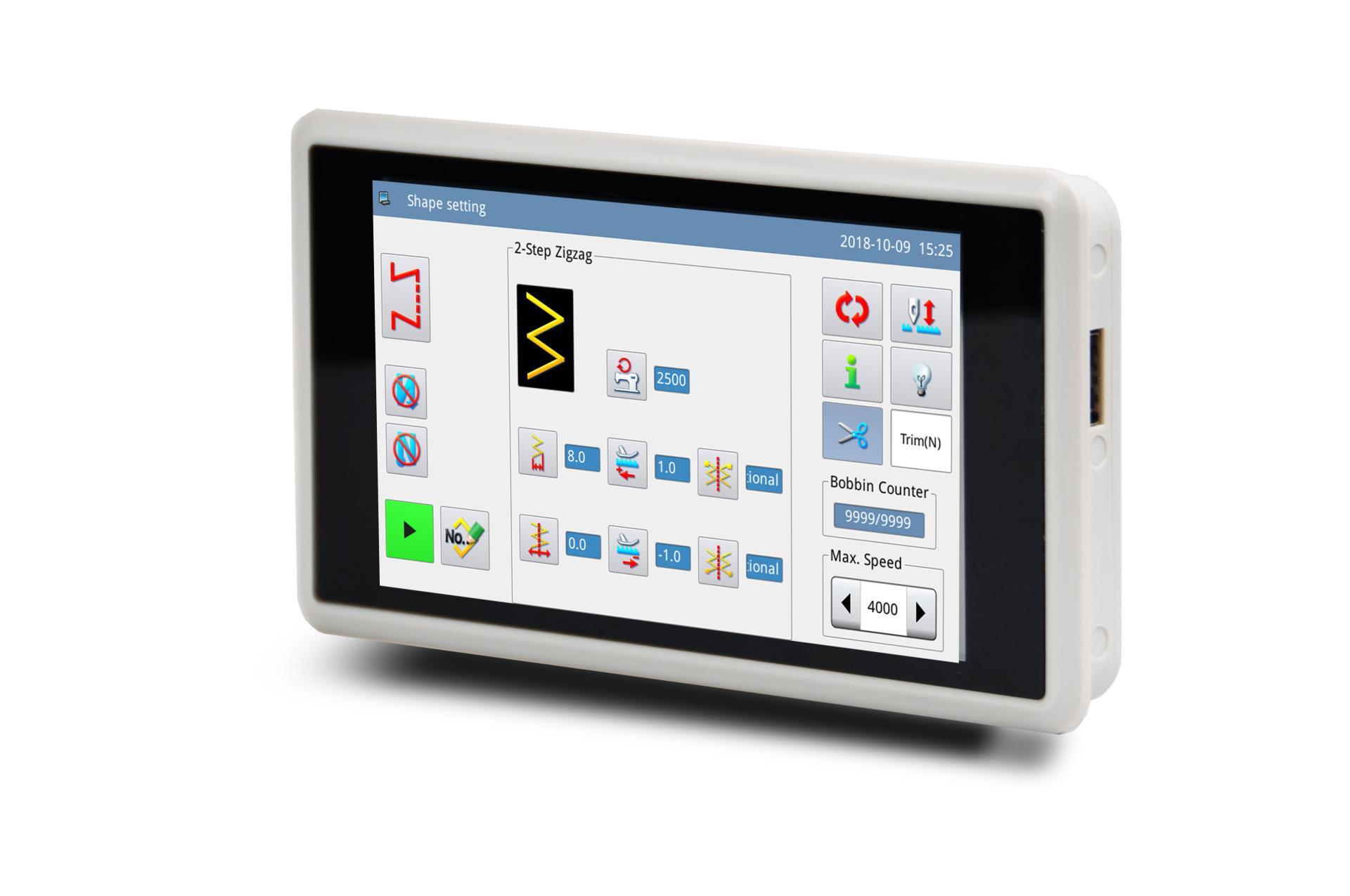 - 多种操作面板可供用户选择,分别为10 英寸/7 英寸/5 英寸真彩液晶触摸屏面板,点阵液晶面板,数码管按键面板,满足高中低档各种机型操作特点的需求。提供花样数据输入输出接口,使用通用USB 接口方式。同时可根据客户的特殊需求定制个性化操作面板的设计方案。操作面板采用图形加多语言注解方式具有高度的可读性,对于初次使用电脑缝纫用户来说非常容易上手,具有优秀的界面友好度。