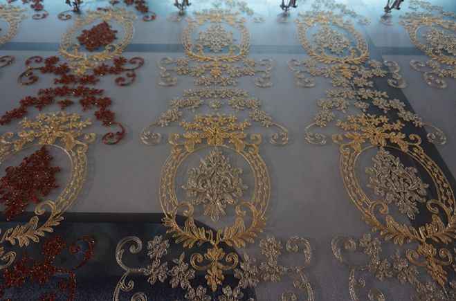 特种绣机型是本届展会的特色,散珠绣、激光、雕孔绣等新元素注入到传统平绣刺绣中,使刺绣再添活力,特色鲜明、色彩丰富的花版,引得众多参观者驻足观望。