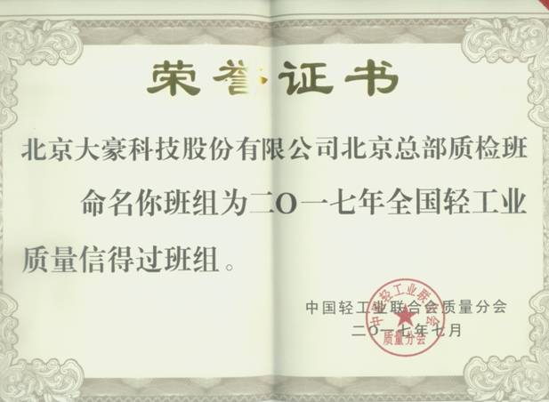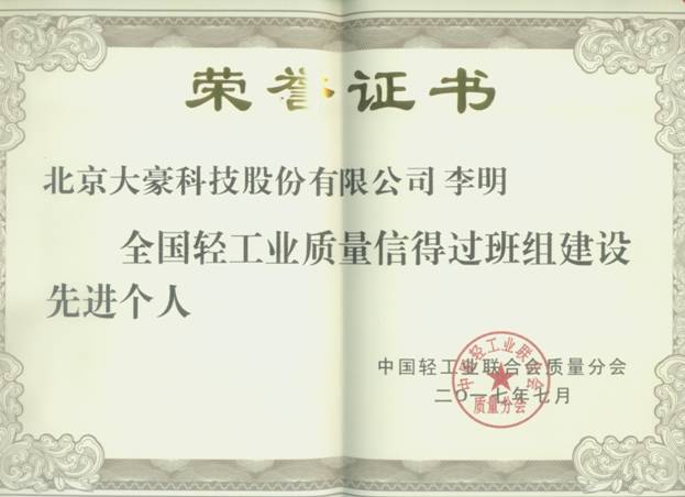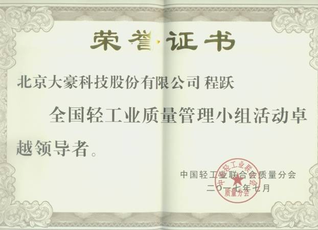 大豪科技一贯重视产品质量工作,把产品质量视为公司核心竞争力之一。在本次质量评奖中,大豪科技共荣获三个奖项,分别是:“全国轻工业质量信得过班组”(北京总部质检班组)、“全国轻工业质量管理小组活动卓越领导者”( 公司管代、质量部经理--程跃)、“全国轻工业质量信得过班组建设先进个人”( 质量部副经理--李明)。