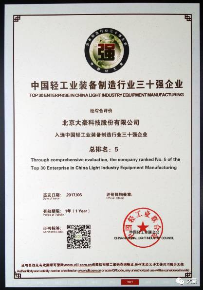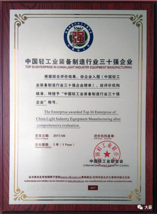 大豪连续6年入选 “轻工百强”、“缝机机械行业十强”名单,本次更是获得首度评选的中国轻工业装备制造行业三十强企业”(排名第五)的优异成绩。这既是对大豪综合实力、研发创新能力、企业成长能力的肯定,也是大豪坚持科技创新、不断高速发展的历史见证。大豪将继续肩负振兴中国缝制及针织设备行业使命与重任,秉承“创新、合作、发展”的经营理念,通过坚持不懈的努力与奋斗,为股东、客户及公司员工创造更大的价值,为国家和民族工业发展贡献更大力量。
