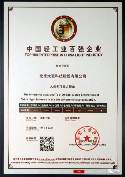 2016年度中国轻工业专项能力百强企业证书