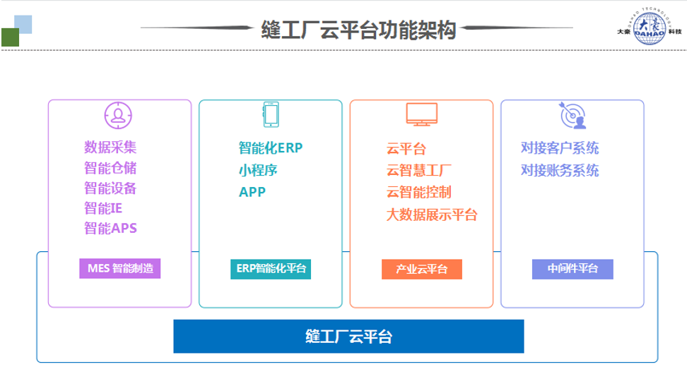 云平台包含面向缝制加工工厂的智能制造系统、全流程系统、进销存系统;面向集团的产能中心调度系统、产品中心系统;面向行业供应链的订单发布与接单系统,全方位适应于不同规模的缝制加工工厂的数字化智能制造需求。