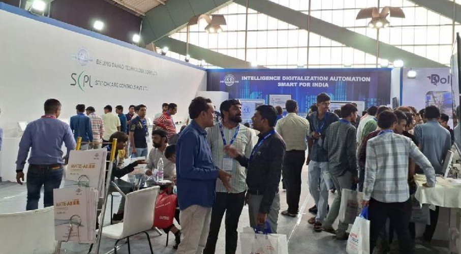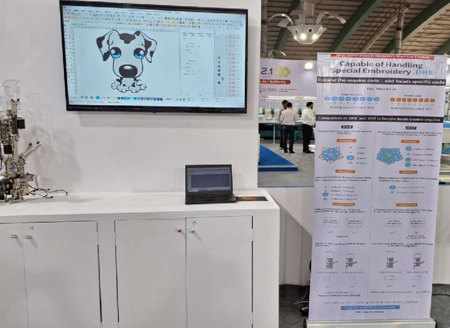 大豪展台面积150平米,展出全新的MATE A8、MATE A9、A15 pro新电控机型产品,并且展出了自动换底线机器人,自动绕线机器人,自动夹框系统等刺绣机智能化解决方案,以及大豪多色散珠电控解决方案,Emcad pro制版系统,RF射频激光装置、大豪闭环绳绣装置等印度市场热门新产品。