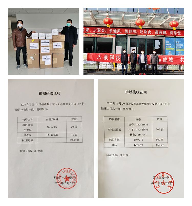2月19日至21日,大豪科技驰援湖北的第一批物资分别从北京、江苏南通、广东深圳启程,向湖北省新冠病毒定点医院——武汉市第一医院、襄阳市枣阳第一人民医院汇集。此次驰援物资均为医院急需的物资,共有1000桶消毒液、500套医院病房床上用品、30台套注射泵、输液泵等。