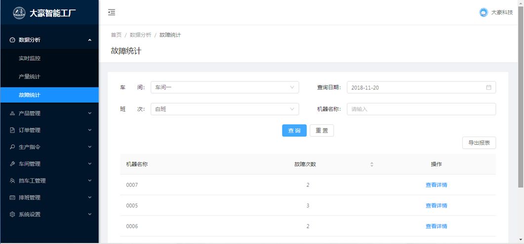可以按班次查看每台机器的故障总次数,点击详情查看每种具体故障的次数;