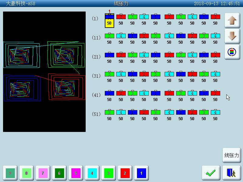 下图是面线张力的设置窗口,上半部分可以任意换色点设置张力值。最下面一行的数字键可以分针位统一修改面线张力,两种设置方法满足了用户的不同应用场景,操作快捷简单。
