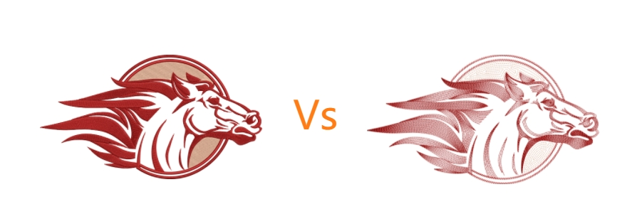 这两匹马,一种采用传统的榻榻米和平针,而另一种则使用周线针、迷宫填充和绳状针。后者的针数不到前者的四分之一,只有8次剪线,而前者是31次,减少75%的针数和剪线!