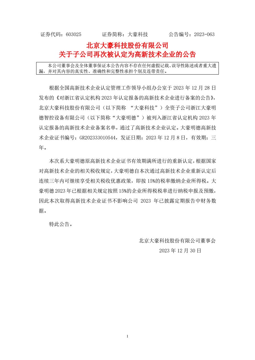 关于子公司再次被认定为高新技术企业的公告