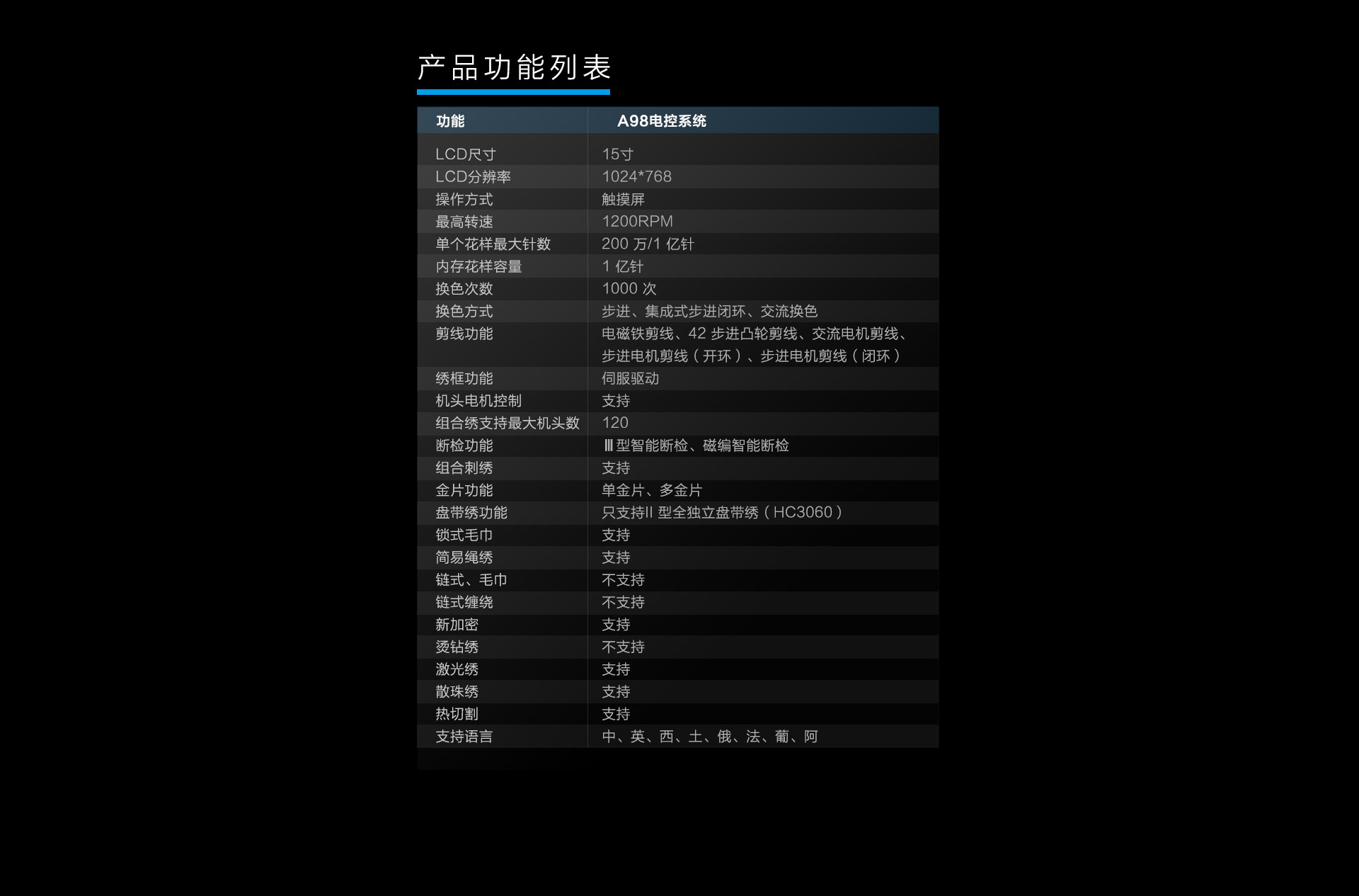 BECS-A98型电脑刺绣机控制系统是大豪公司推出的一款高端刺绣机电控产品,突破以往刺绣机电控系统设计理念,集成一体式电控架构优化设计,实现了主控系统和驱动系统的集成整合,控制性能得到提升;电控与整机接口大幅减少,电控安装应用更加简单方便;刺绣机专用的多轴联动控制技术,实现对主轴、X/Y绣框高速协同控制,实现绣品质量和刺绣效率的提升;系统采用全数字开关电源技术,不受电网波动影响,系统供电更加稳定,电磁兼容性和抗干扰性大大提高的同时,降低电控硬件故障率。 A98 是大豪新一代的旗舰型刺绣机电控机型,面向高端应用市场,特别适合高速精品机、多种功能组合复杂刺绣应用。