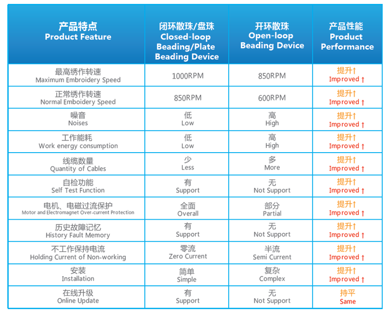 - 2、 不丢步,绣品更好:电机速度快,更短时间达到指定位置,有效降低漏珠率,绣品更好;推珠电机加装编码器控制,采用闭环控制,有效避免了开环丢步的缺点。