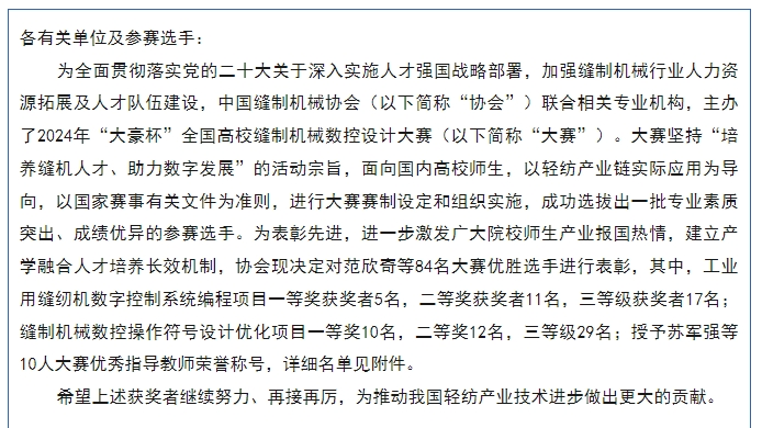 【企业新闻】中国缝制机械协会对2024年“大豪杯”全国高校缝制机械数控设计大赛优胜选手及指导教师进行表彰